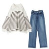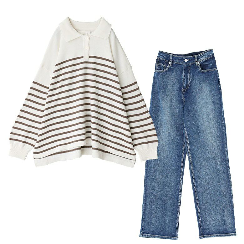 『パネルボーダーニットポロ×お腹すっきりデニムパンツコーデ2点SET』