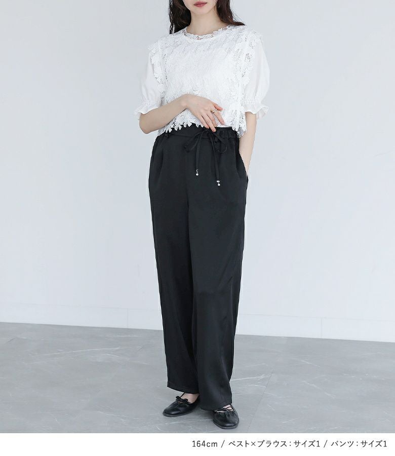 4. 【送料無料】『レースベスト・ブラウスセット×フェイクパールベルト付きサテンカーブパンツコーデ2点SET』【メール便不可】【20】