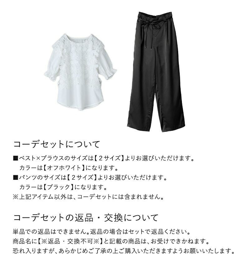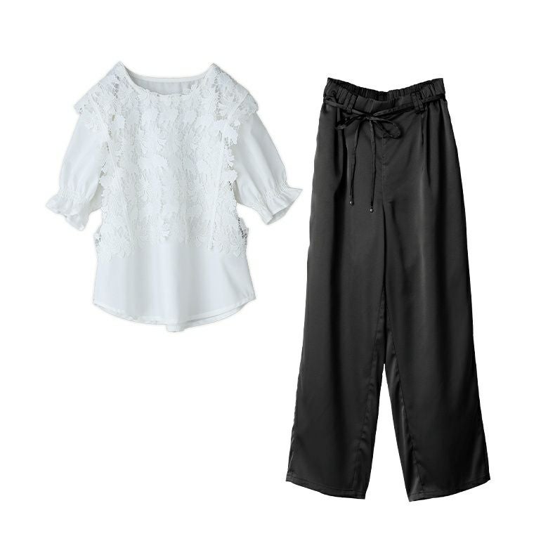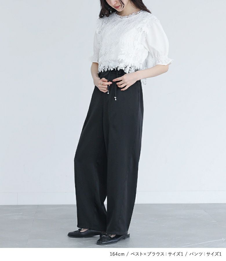 『レースベスト・ブラウスセット×フェイクパールベルト付きサテンカーブパンツコーデ2点SET』