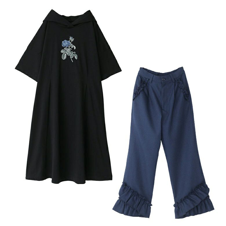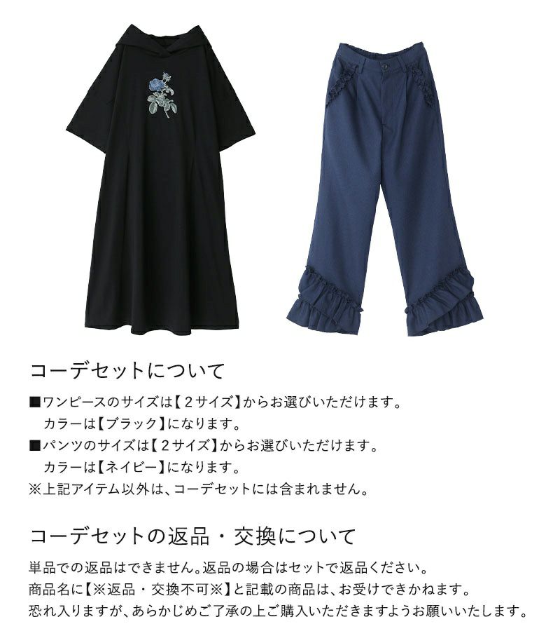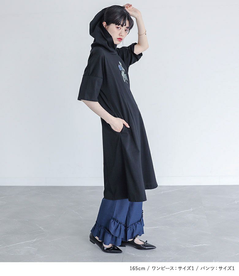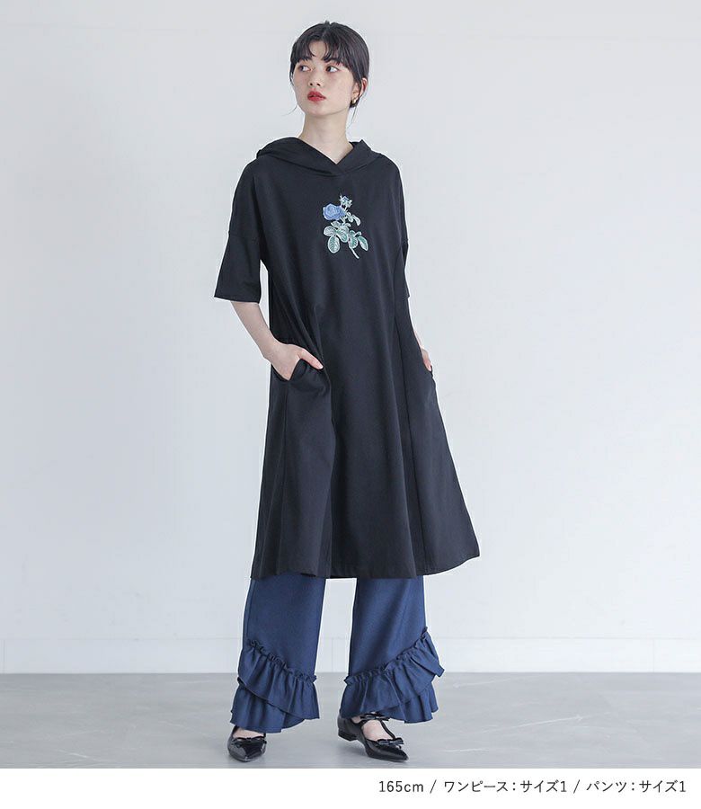 『冷感フラワー刺繍フードワンピース×裾フリルフレアパンツコーデ2点SET』
