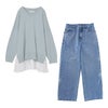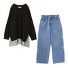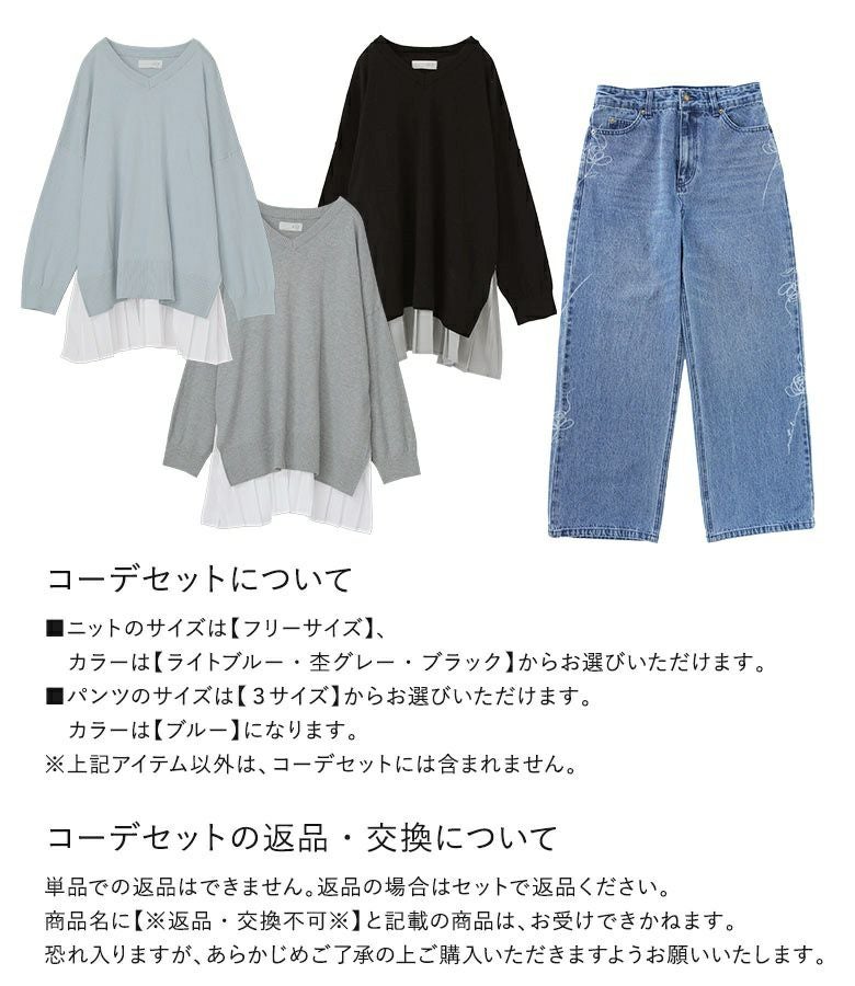 『異素材バックプリーツVネックニット×花柄モチーフストレートデニムパンツコーデ2点SET』