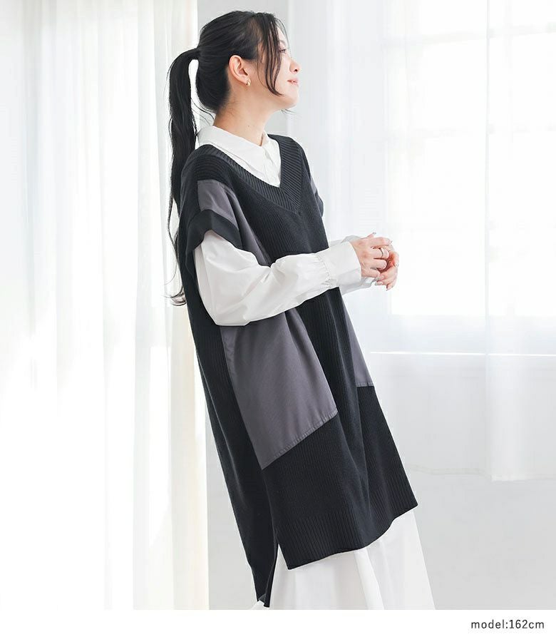 4. 『異素材ロングニットベスト×袖ギャザーシャツワンピースコーデ2点SET』【メール便不可】【40】