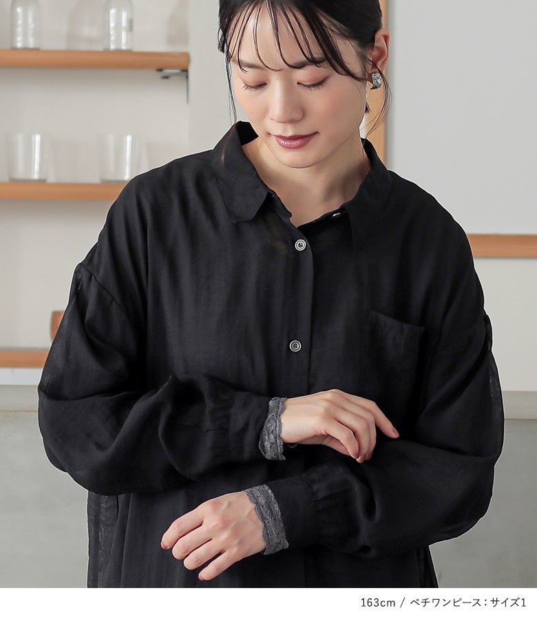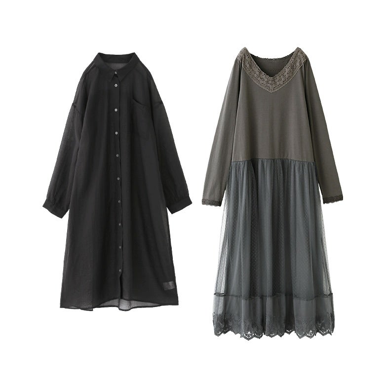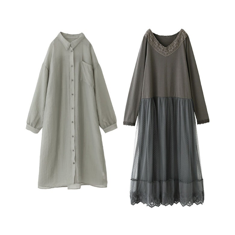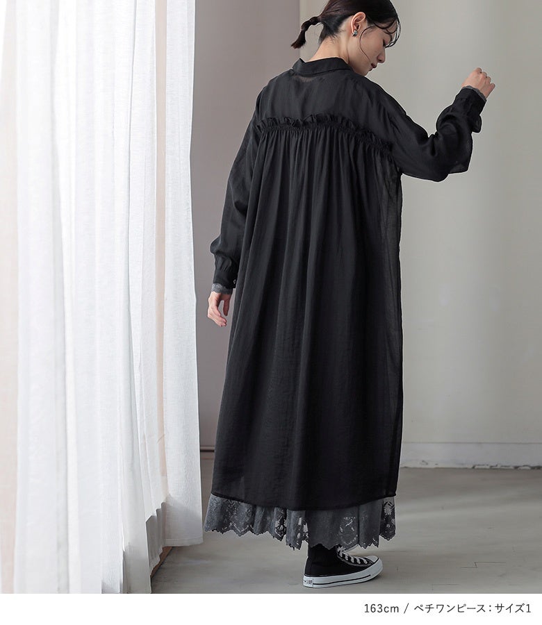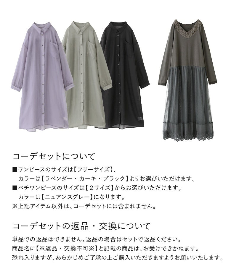 『バックギャザーシアーシャツワンピース×贅沢レース長袖ペチワンピースコーデ2点SET』