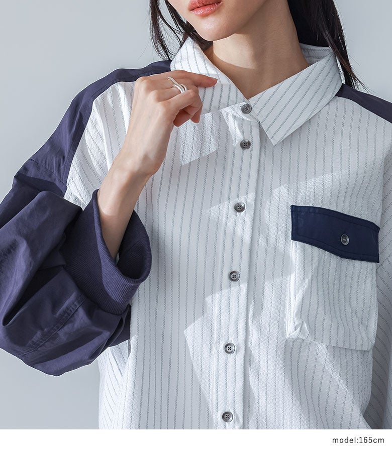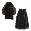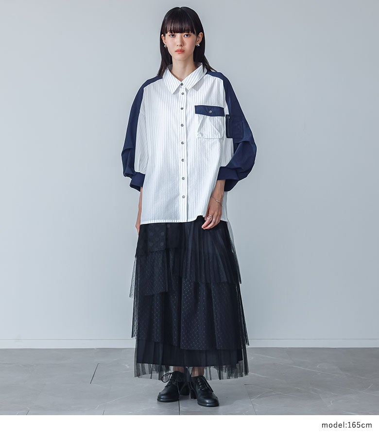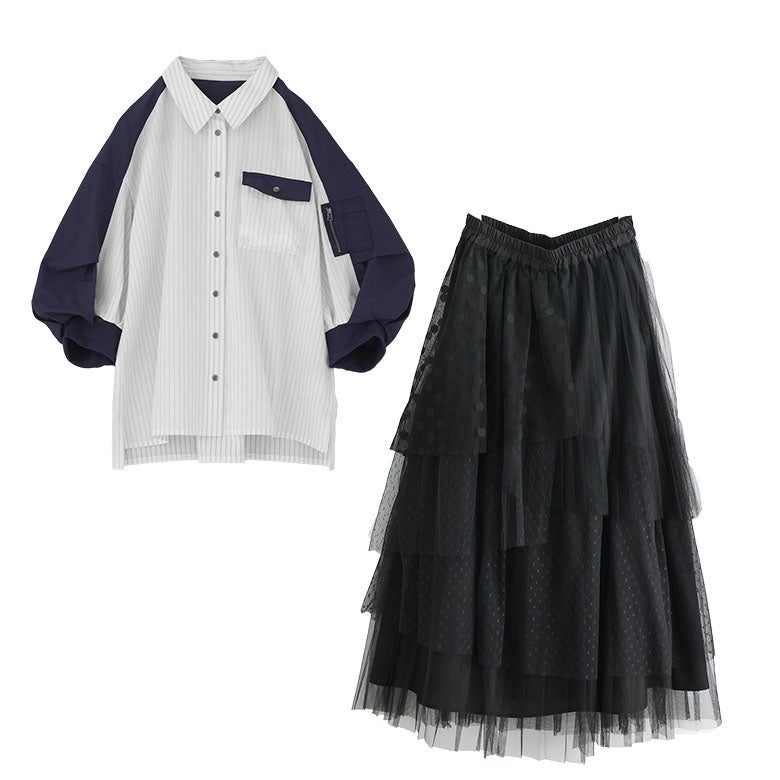 『異素材袖デザインシャツ×ドットチュールプリーツスカートコーデ2点SET』