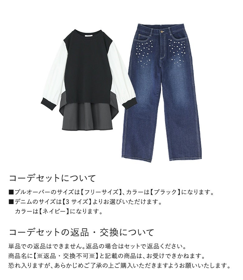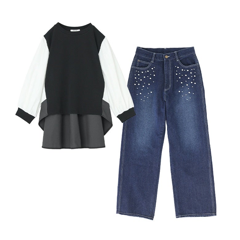 『ベスト風シャツ配色プルオーバー×フェイクパール付きストレートデニムコーデ2点SET』