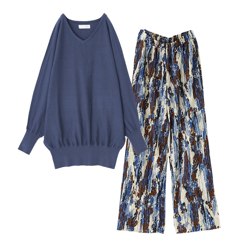 『Vネックドルマンニット×セルフカットプリーツパンツコーデ2点SET』