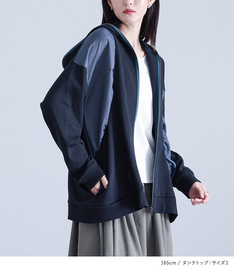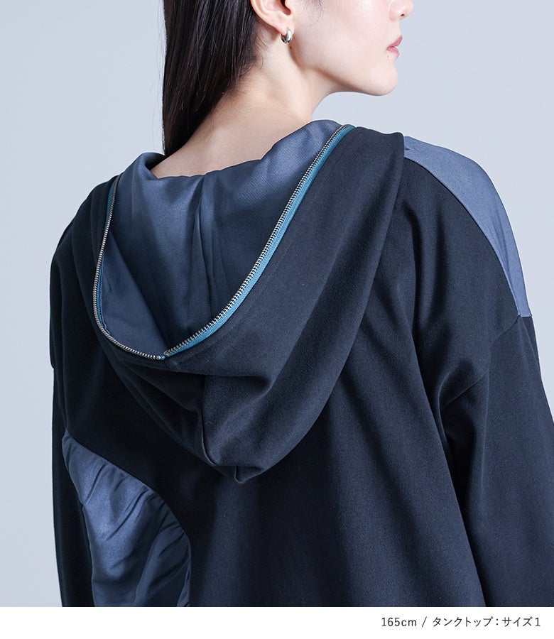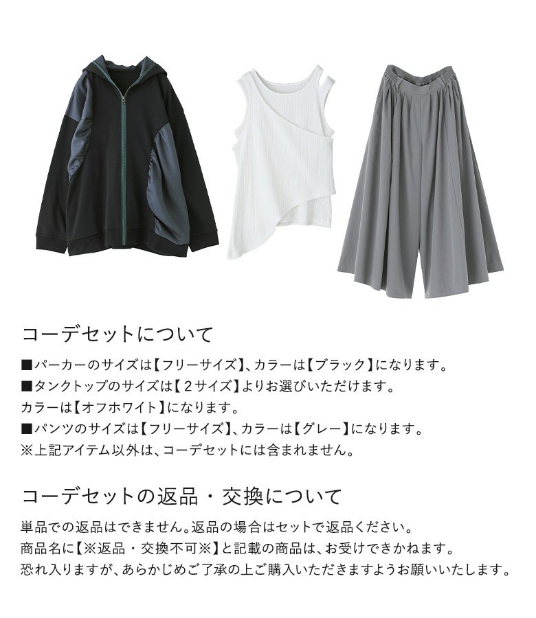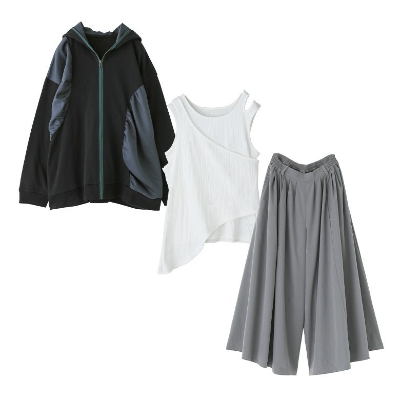 『異素材ギャザー切替パーカー×変形2枚重ねリブタンクトップ×ボリュームワイドパンツコーデ3点SET』