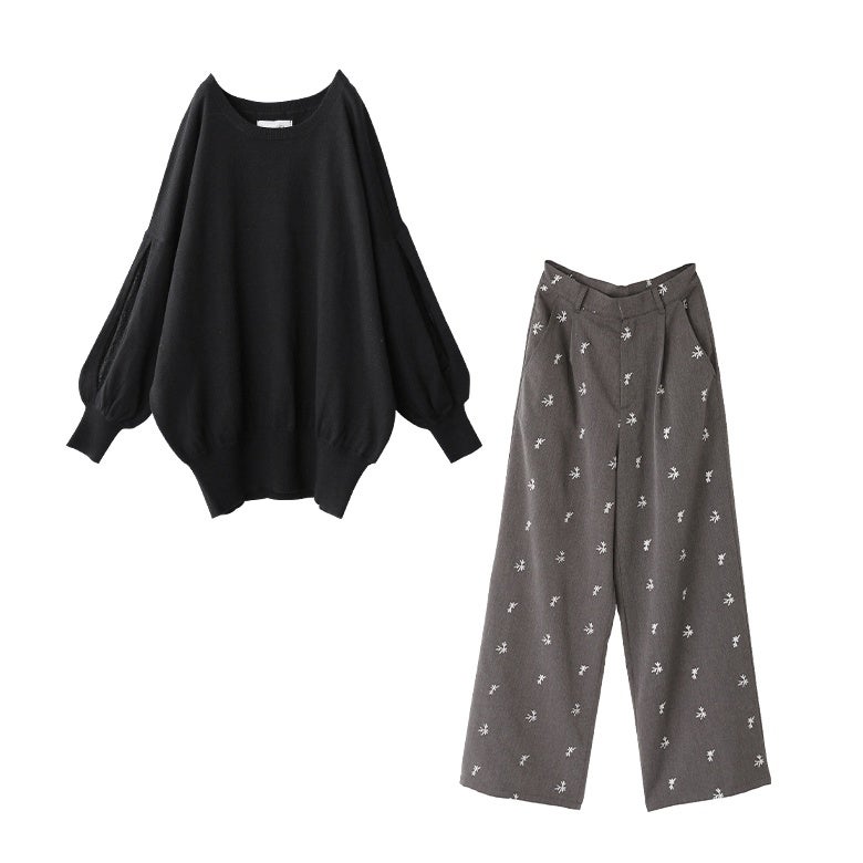 『スラッシュスリーブレースニット×花柄刺繍スラックスコーデ2点SET』