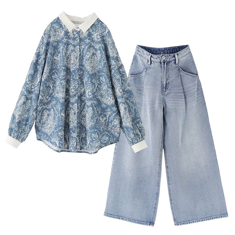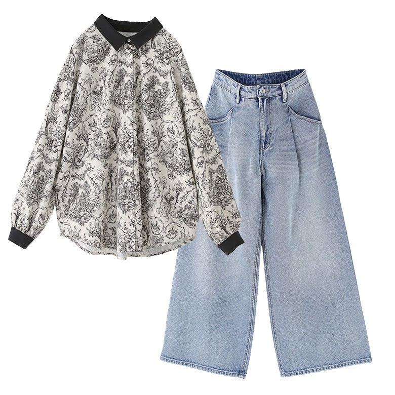 『トワルドジュイ柄シャツ×タックデニムパンツコーデ2点SET』