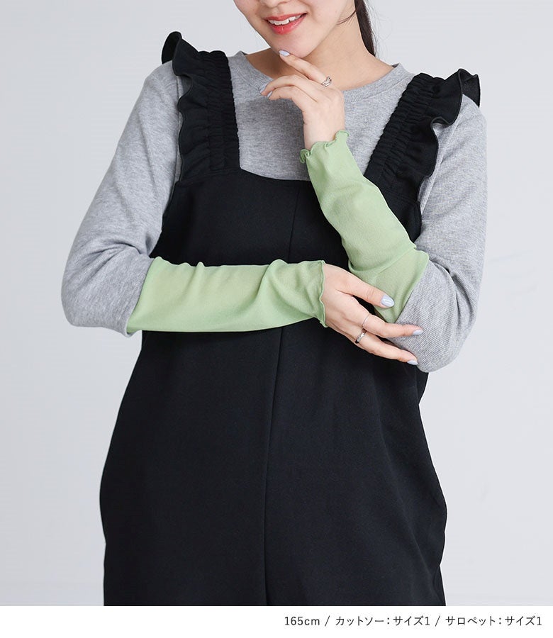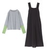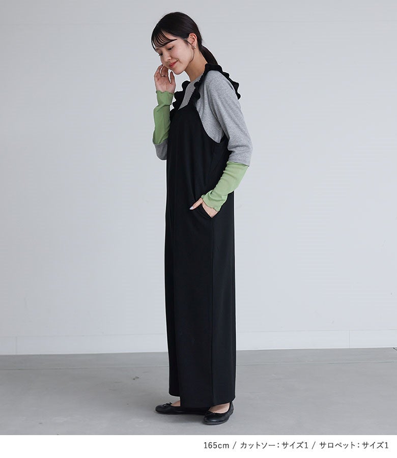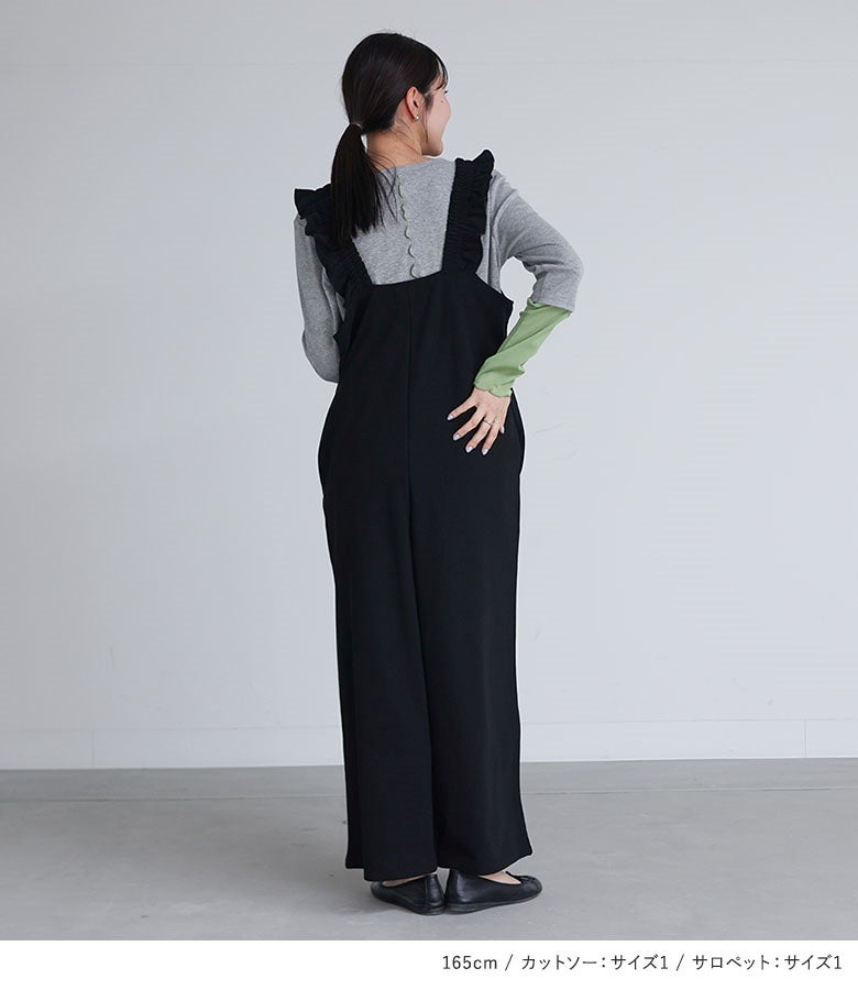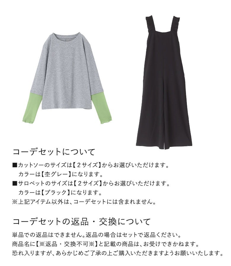 『袖シアー切替カットソー×肩フリルサロペットコーデ2点SET』
