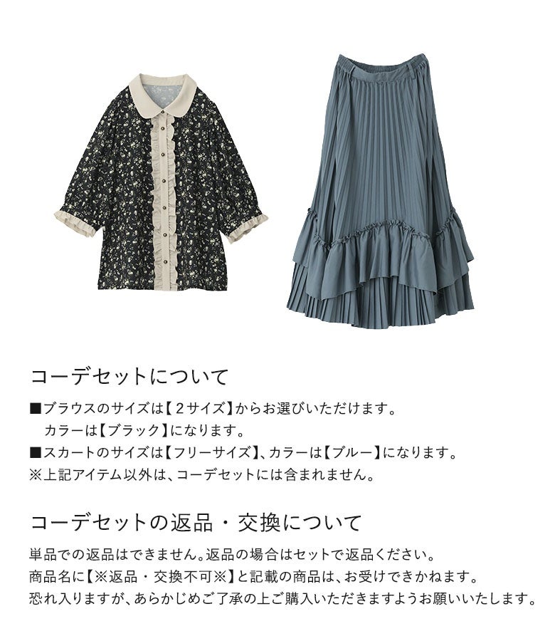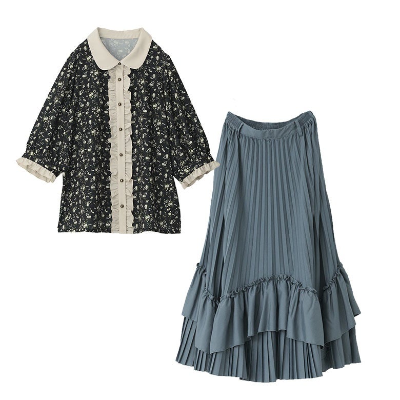 『花柄配色ブラウス×ティアードプリーツスカートコーデ2点SET』
