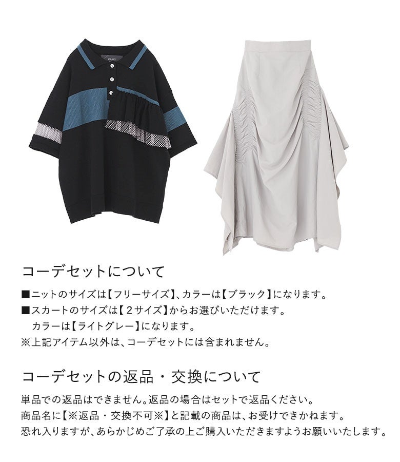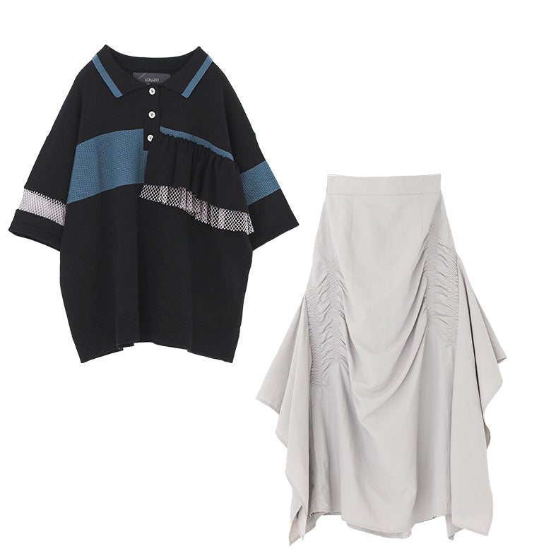 『配色フリルポロニット×アシンメトリーシャーリングスカートコーデ2点SET』