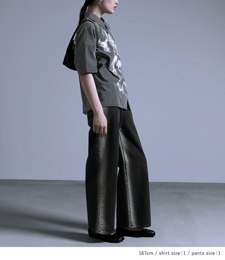 『かすれプリントストライプ柄シャツ×ブリーチラインデニムパンツコーデ2点SET』
