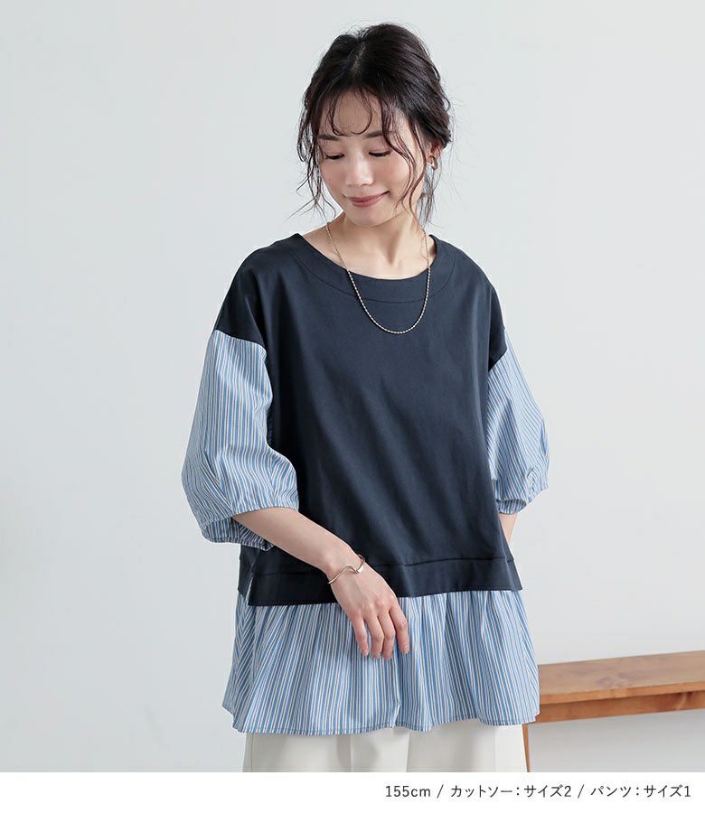 4. 『異素材ストライプペプラムカットソー×タックワイドスラックスコーデ2点SET』【メール便不可】【30】