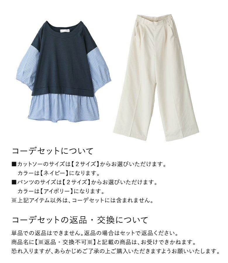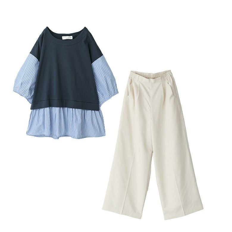 『異素材ストライプペプラムカットソー×タックワイドスラックスコーデ2点SET』