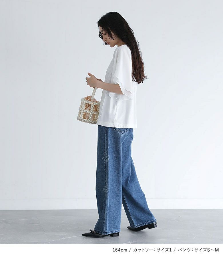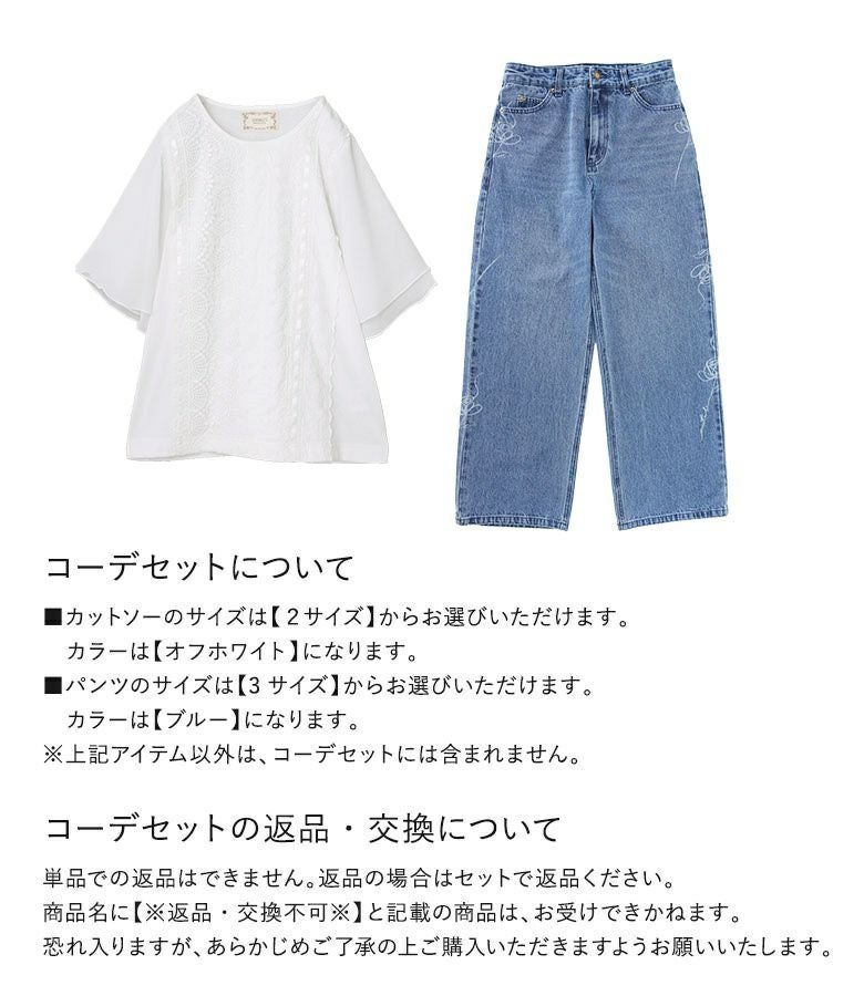 4. 【送料無料】『フレア袖レースデザインカットソー×花柄モチーフストレートデニムパンツコーデ2点SET』【メール便不可】【30】
