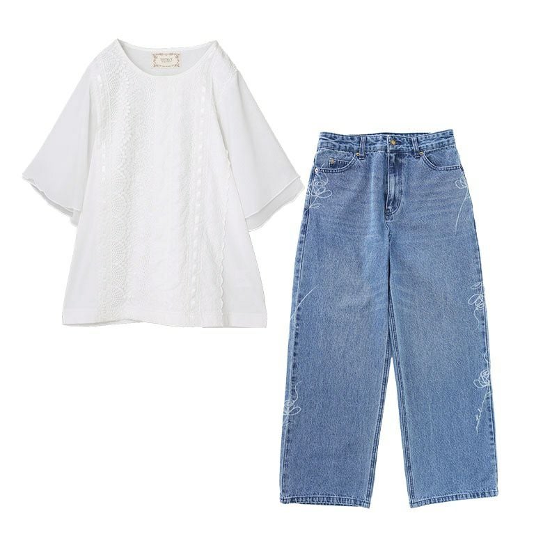 『フレア袖レースデザインカットソー×花柄モチーフストレートデニムパンツコーデ2点SET』