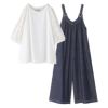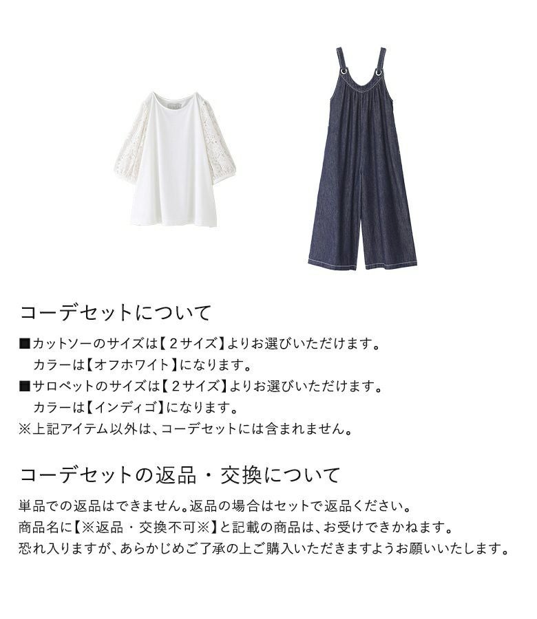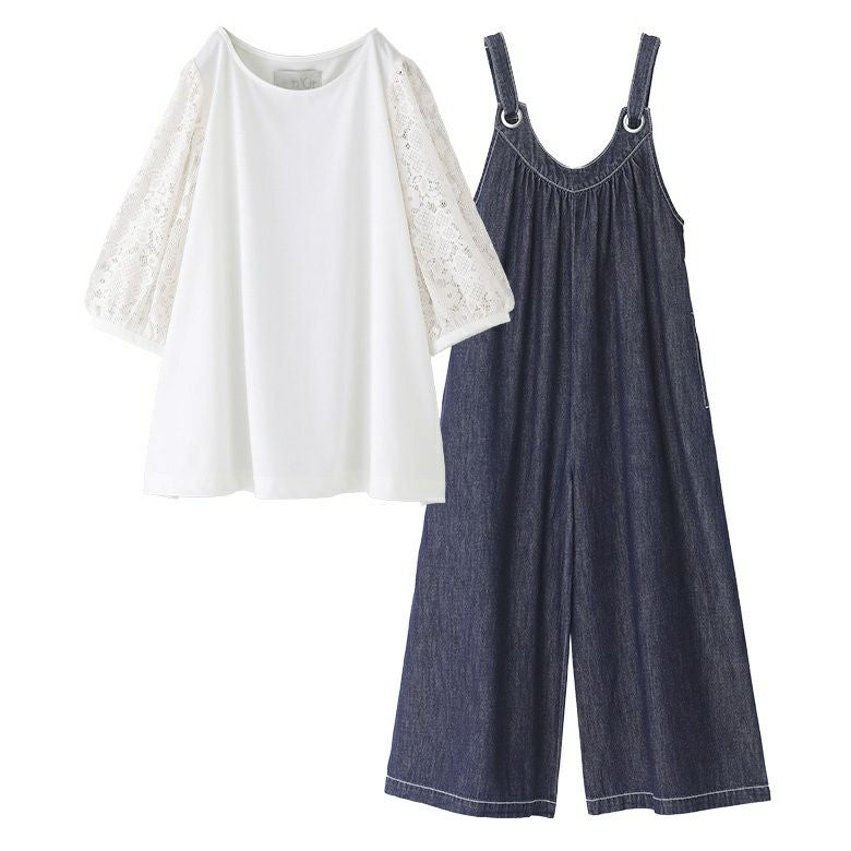 『レースギャザースリーブカットソー×ワイドデニムサロペットコーデ2点SET』