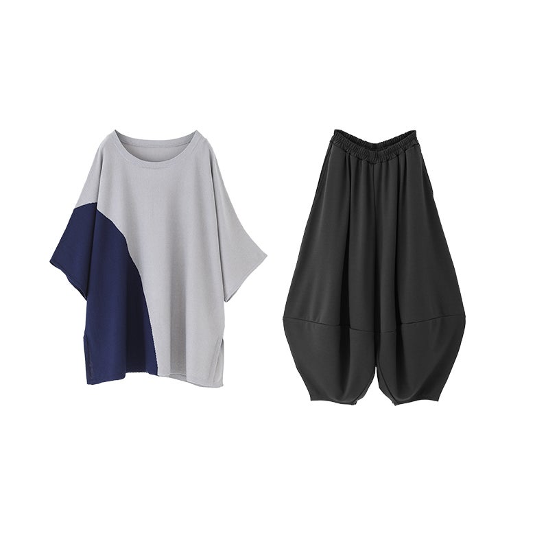 『冷感ドルマン配色ニット×ポンチコクーンパンツコーデ2点SET』