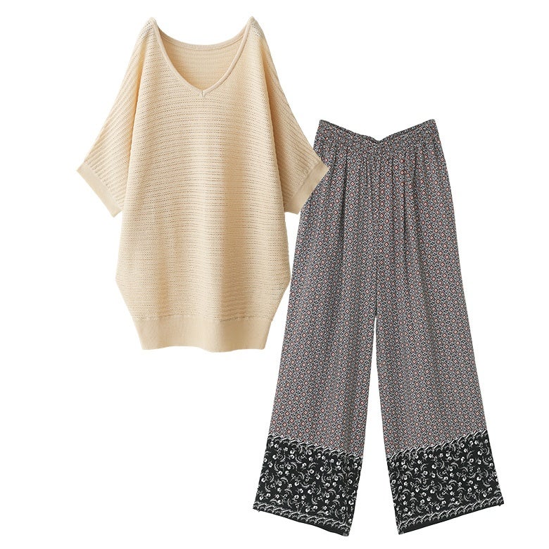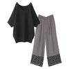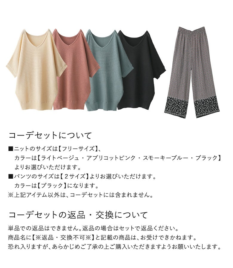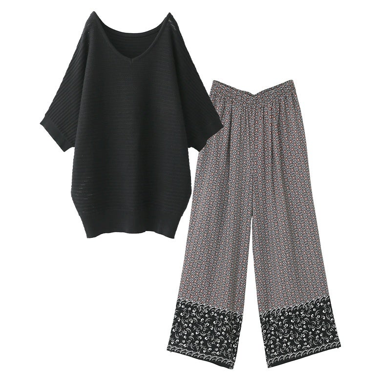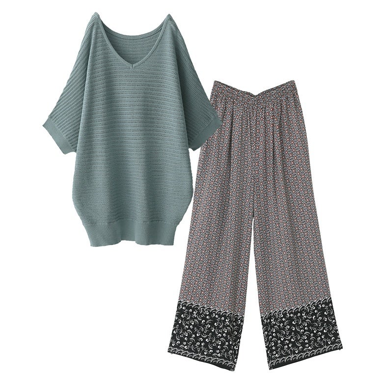 『透かし編みドルマンサマーニット×パネル柄ギャザーイージーパンツコーデ2点SET』