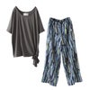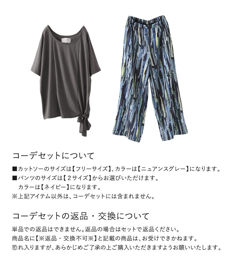 『裾リボンデザインカットソー×水彩プリントワイドパンツコーデ2点SET』