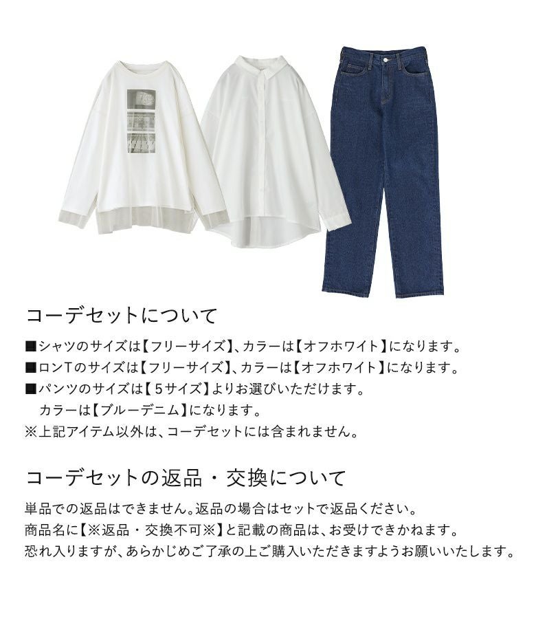 4. 【送料無料】『バックボタンスリットシャツ×フォトプリントロンT&チュールプルオーバーセット×ストレートデニムパンツコーデ3点SET』【メール便不可】【35】