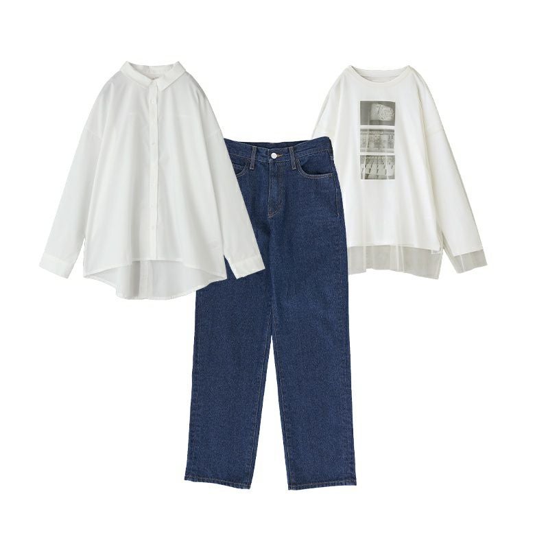 『バックボタンスリットシャツ×フォトプリントロンT&チュールプルオーバーセット×ストレートデニムパンツコーデ3点SET』