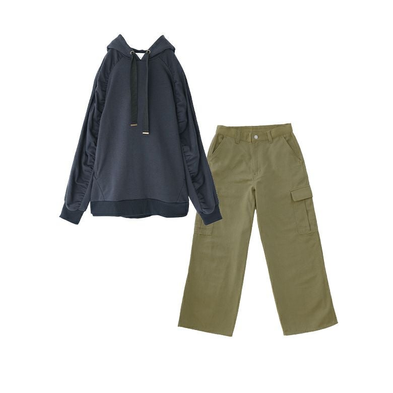 『袖ギャザーフードスウェット×ワイドカーゴパンツコーデ2点SET』