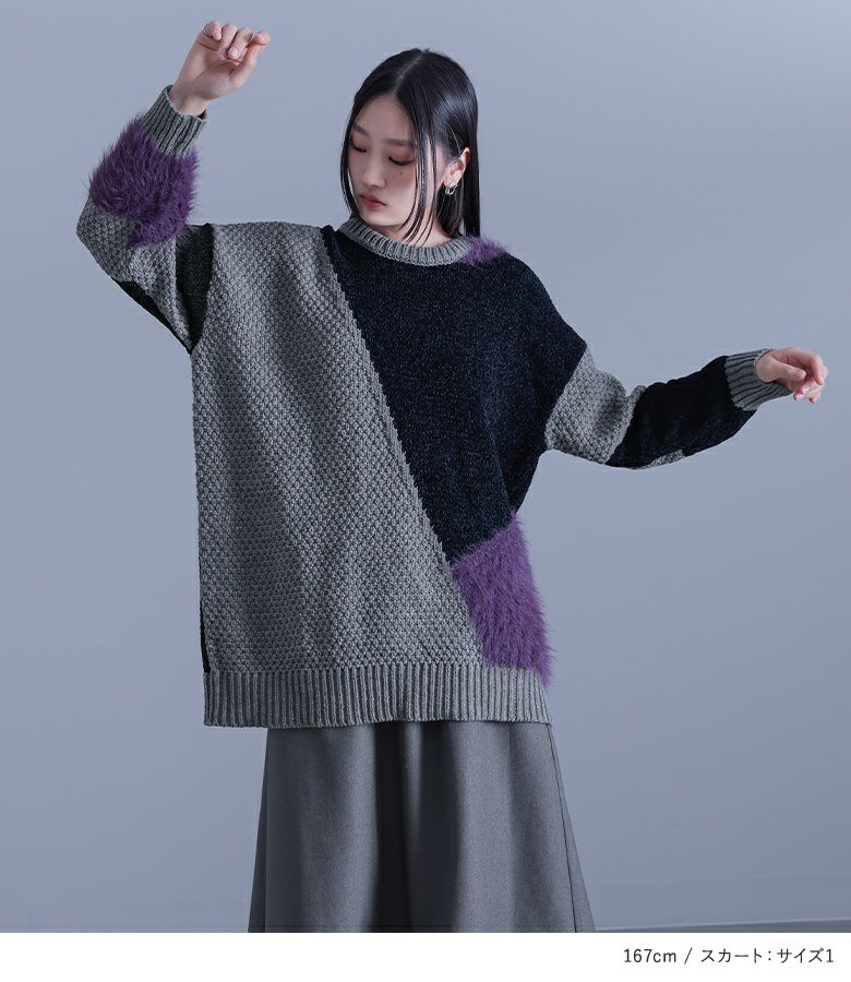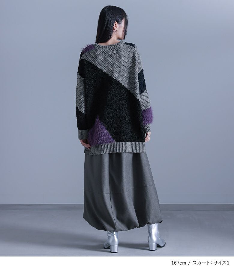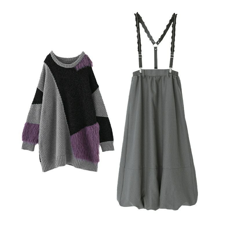 『切り替え配色モードシャギーニットトップス×サスペンダー付きバルーンスカートコーデ2点SET』