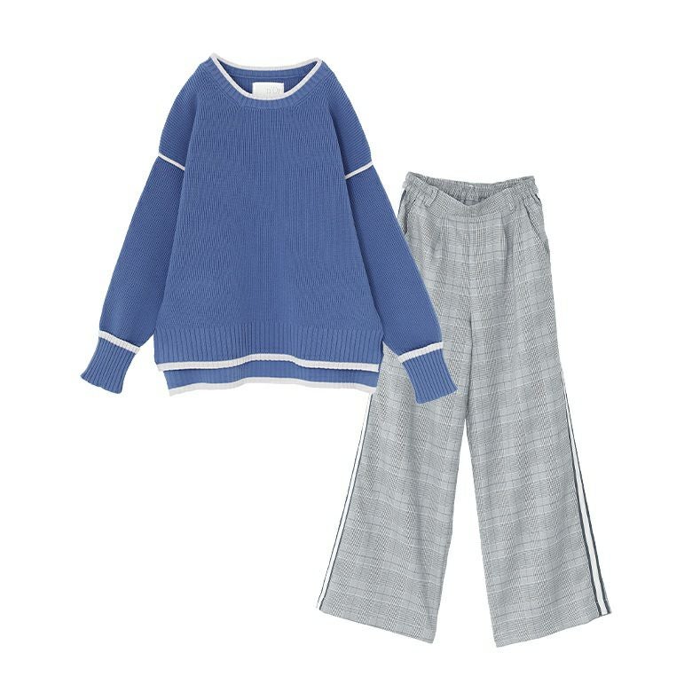 『配色ラインスポンジニット×サイドラインチェックパンツコーデ2点SET』