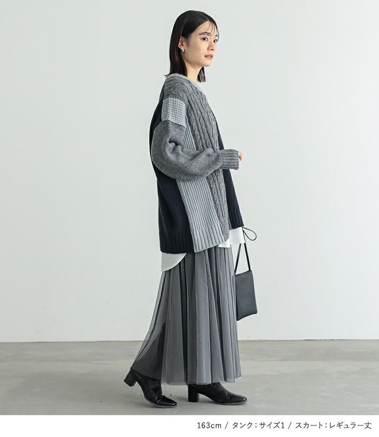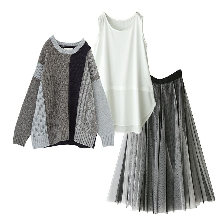 『配色柄切替ニット×吸水速乾レイヤードタンクトップ×配色ボリュームチュールスカートコーデ3点SET』