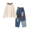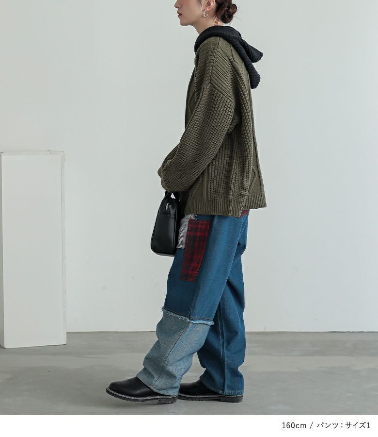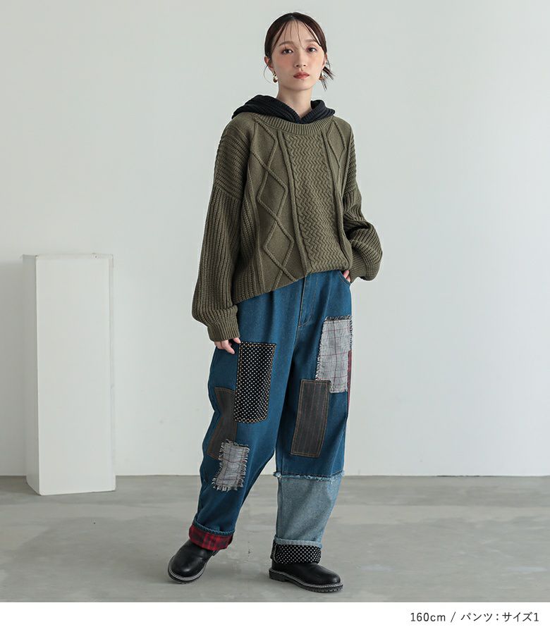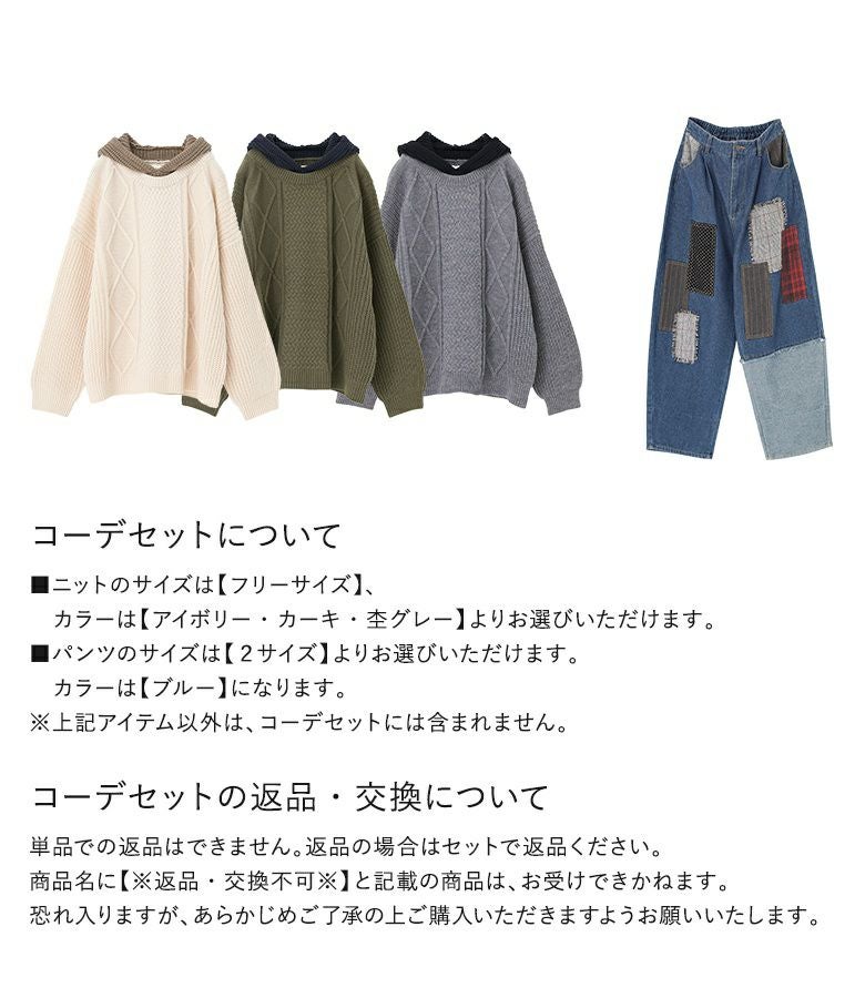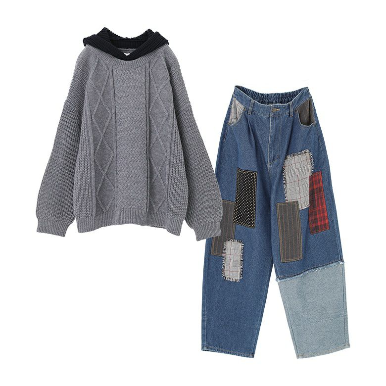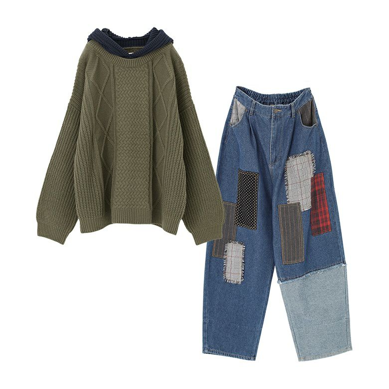 『パッチワークデニムパンツ×ケーブル編みフードニットコーデ2点SET』