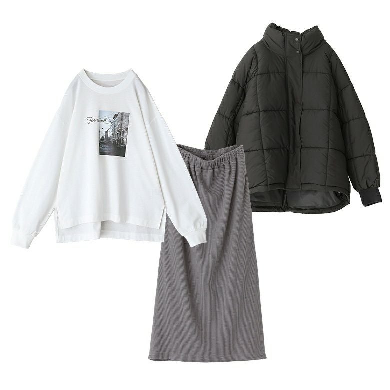 『リブニットソースカート×プリント刺繍ロンT×中綿ボリュームブルゾンコーデ3点SET』