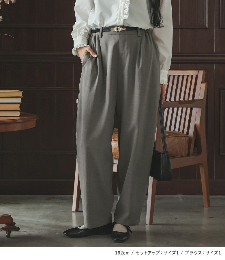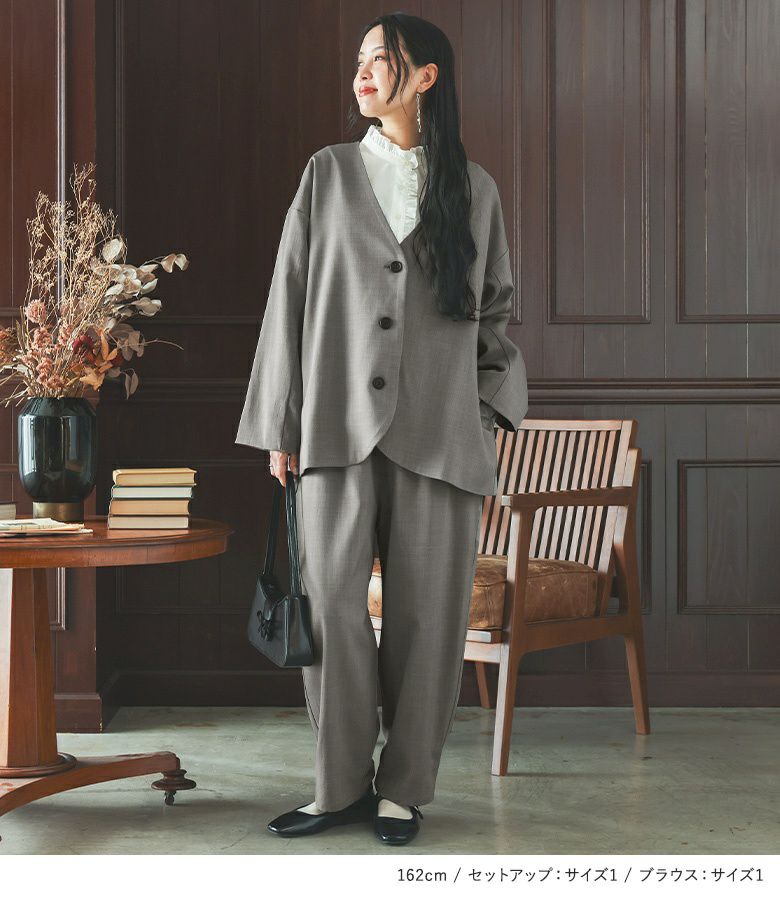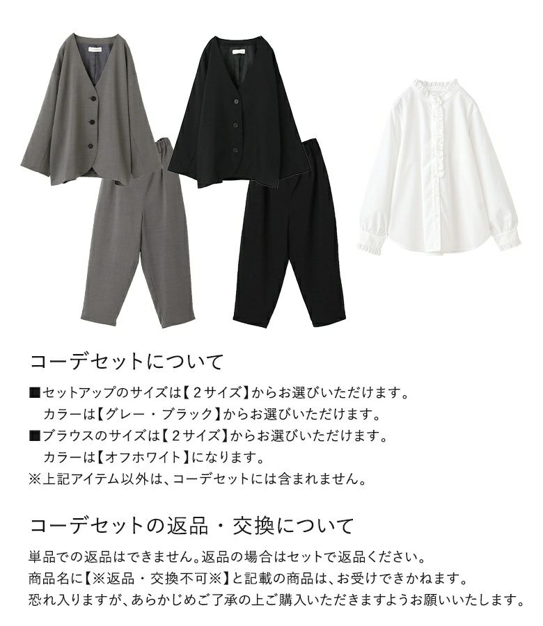 『ノーカラーラウンドヘムジャケット×コクーンパンツセット×ギャザーフリルブラウスコーデ2点SET』