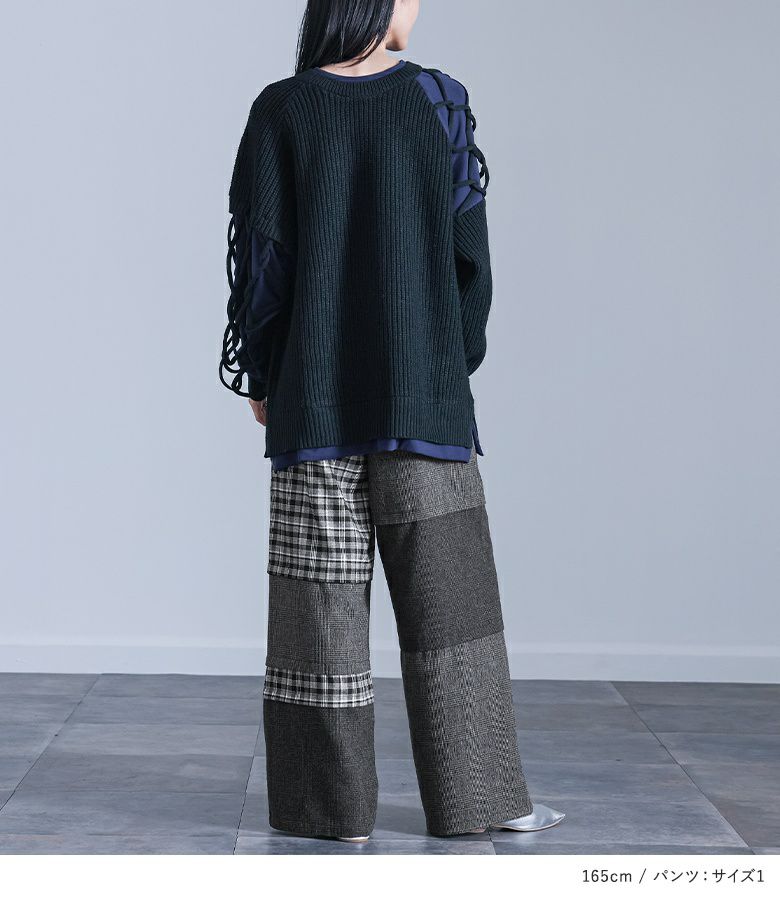4. 【送料無料】『異素材ドッキングクロスデザインニット×チェック切替ワイドパンツコーデ2点SET』【メール便不可】【60】