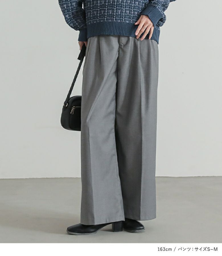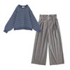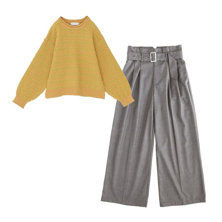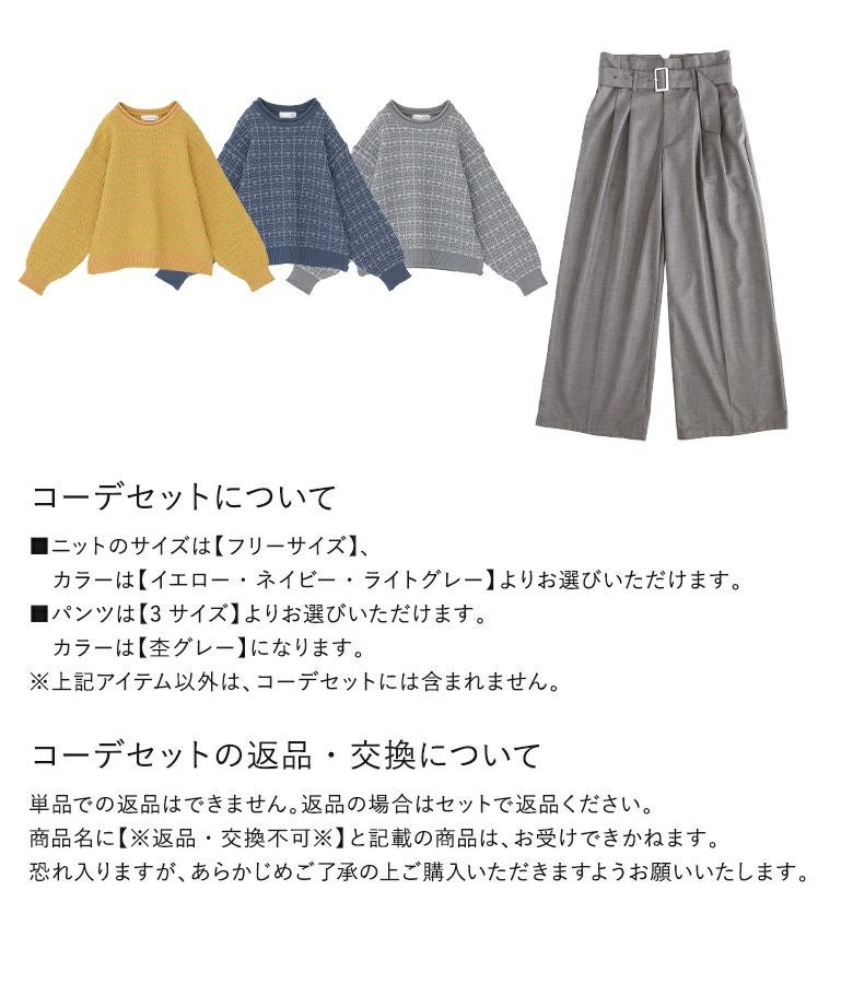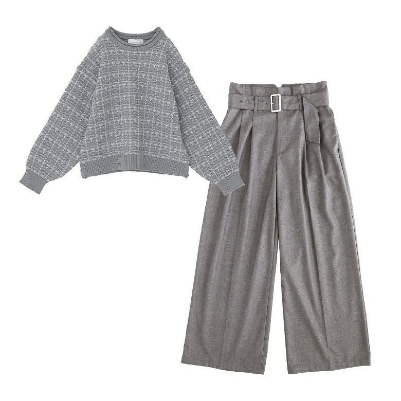 『ツイード調ニット×ベルト付きハイウエストタックワイドパンツコーデ2点SET』