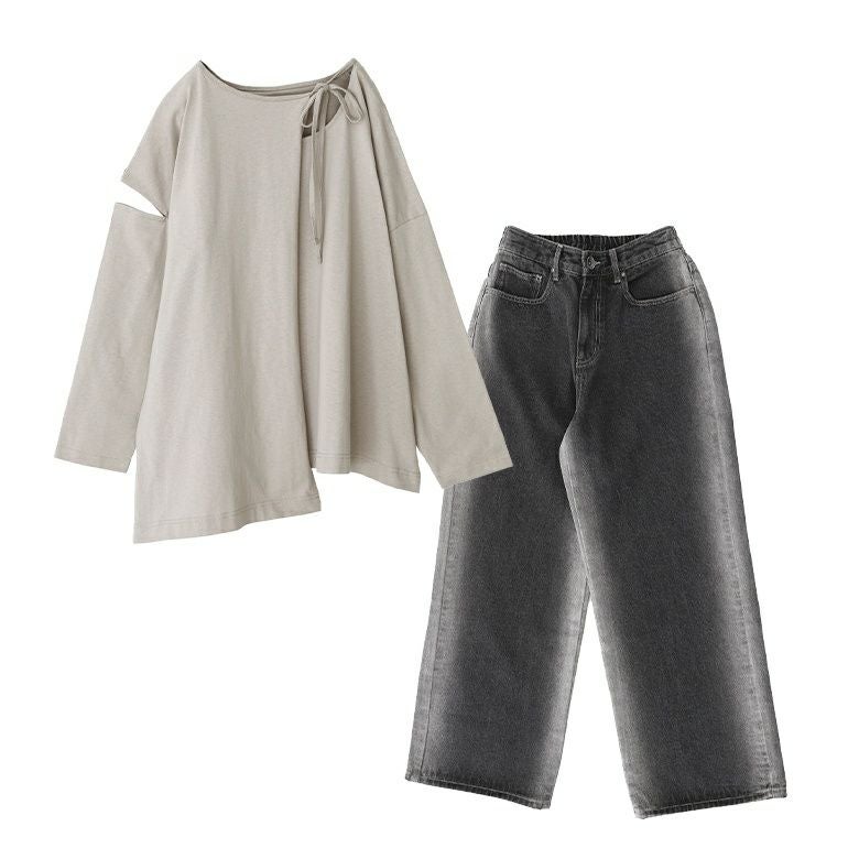 『カッティングロンT×ブリーチラインデニムコーデ2点SET』