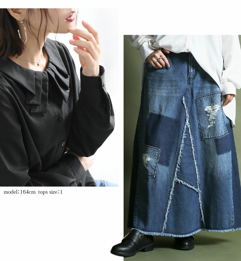 センスを高めるタック襟デザインのブラウスに、デザイン性の高いリメイク風デニムスカートを合わせれば、品のあるラフモードな印象に。