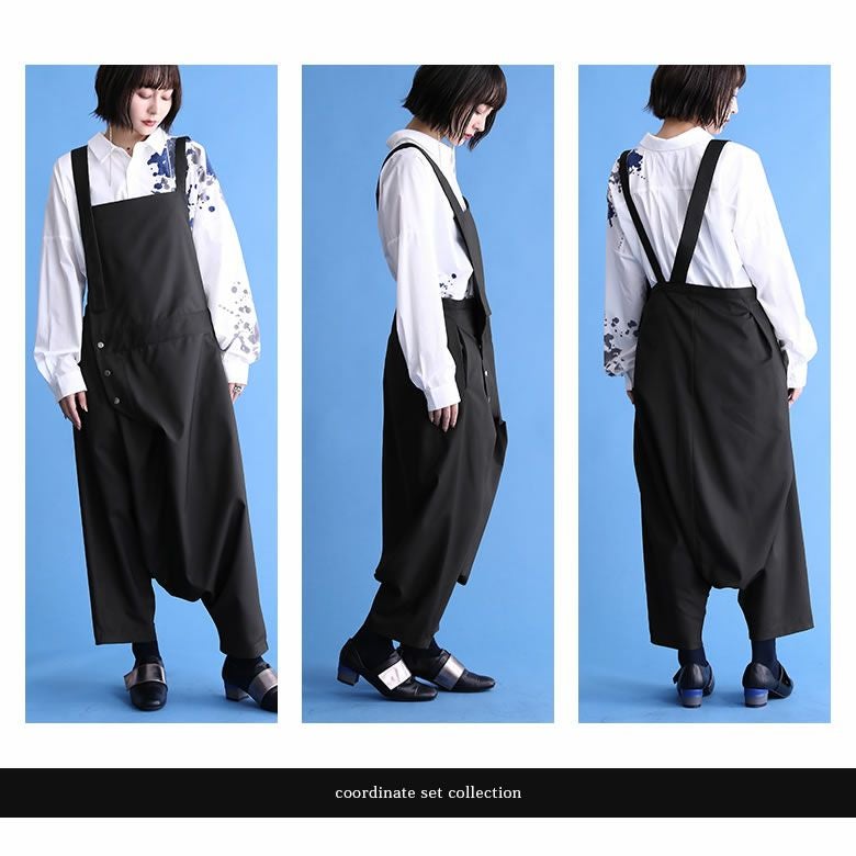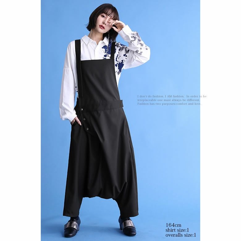 アートのようなスプラッシュペイントが目を惹くビッグシルエットシャツに、複雑な変形パターンとアレンジ力が魅力のサロペット。