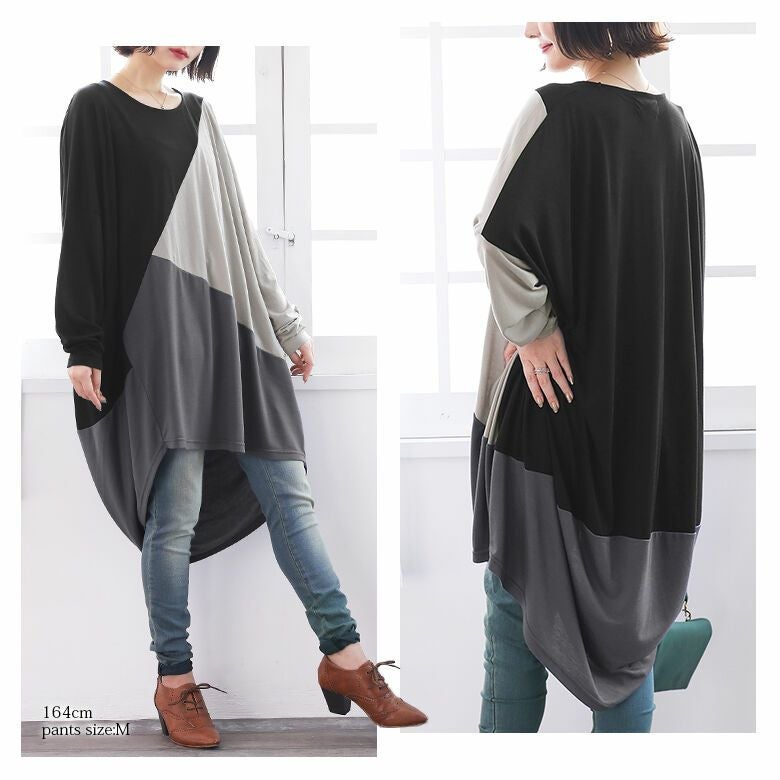 アシメな配色と後ろ下がりのシルエットが魅力のカットソーに、ストレッチの効いたスキニーデニムを合わせればメリハリのあるバランスが完成します。