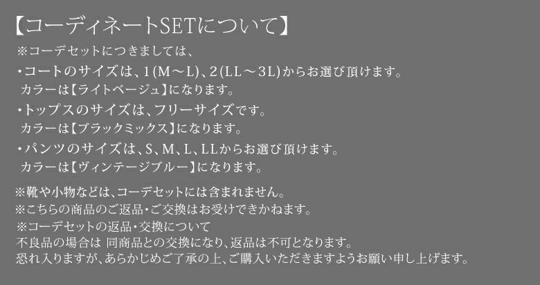 ※コーデセットの返品・交換について。不良品の場合は同商品との交換となり、返品は不可となります。恐れ入りますが、予めご了承の上、ご購入いただけますよう宜しくお願い申し上げます。