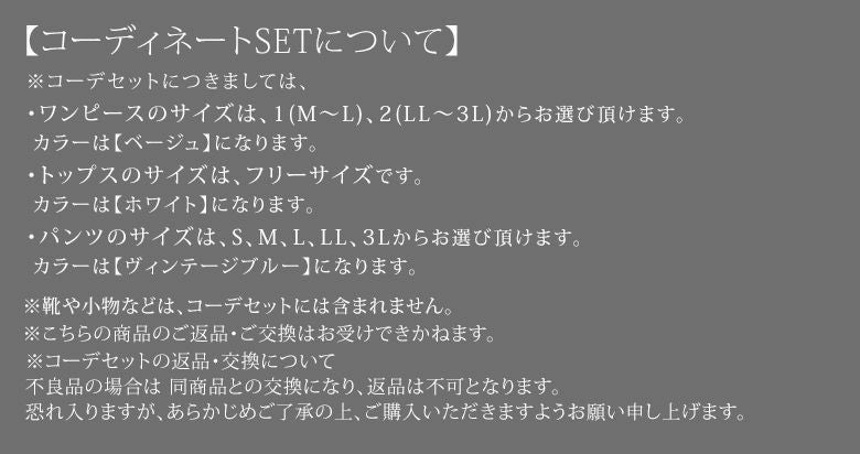 ※コーデセットの返品・交換について。不良品の場合は同商品との交換となり、返品は不可となります。恐れ入りますが、予めご了承の上、ご購入いただけますよう宜しくお願い申し上げます。