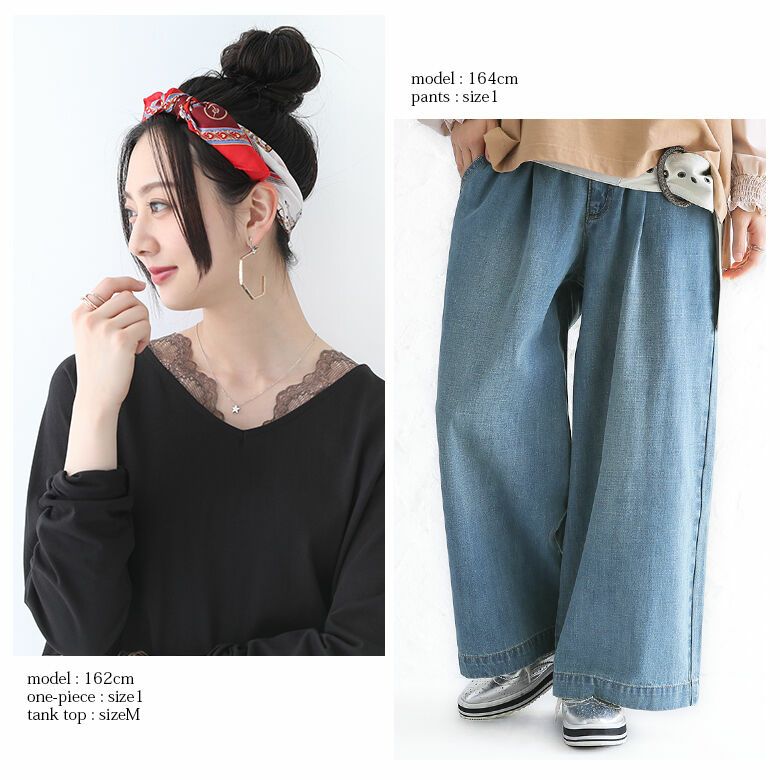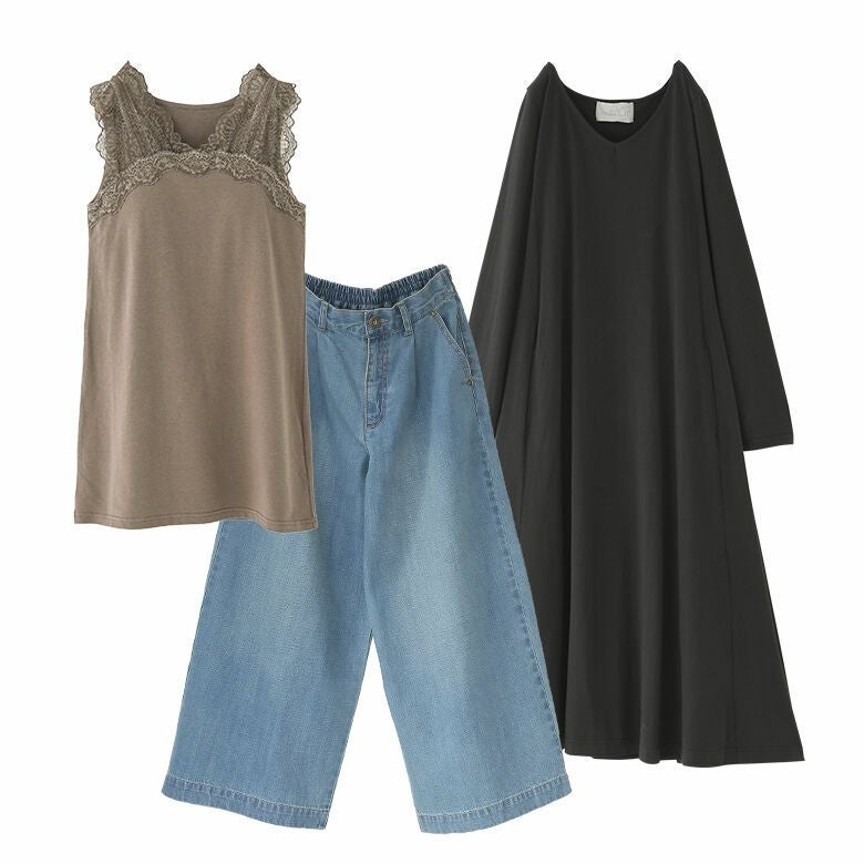 すっきりと穿けるワイドデニムを合わせた、レースがポイントの大人カジュアル3点コーディネートSET。