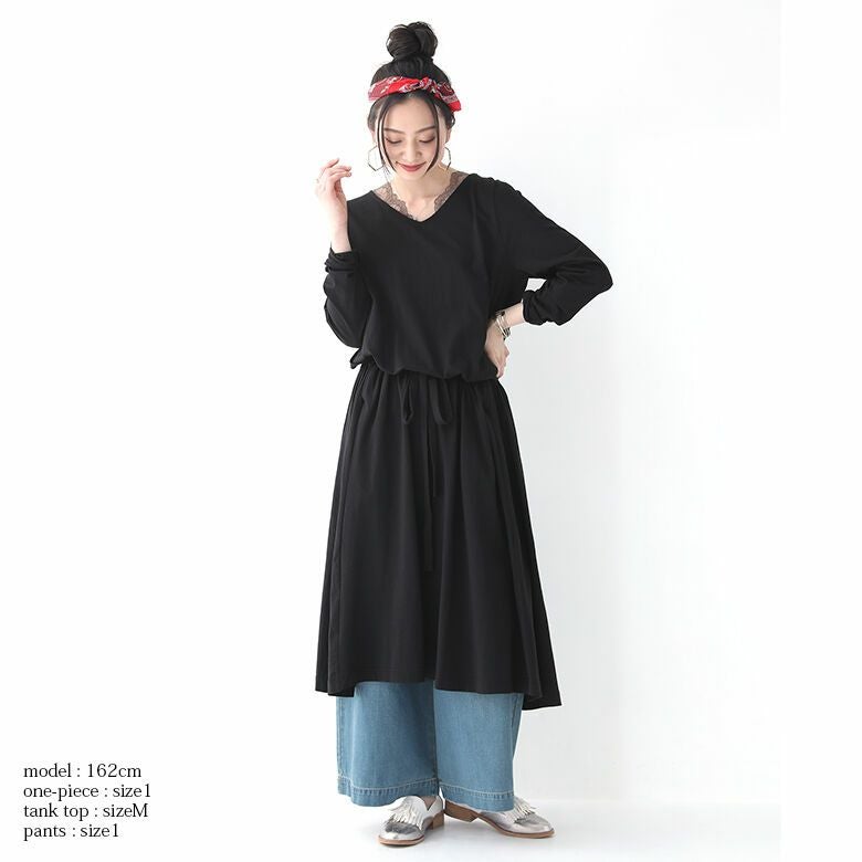 シルエットが綺麗なコットンカットソーワンピースに、肩レースブラトップを覗かせてコーデに華やかさをプラス。