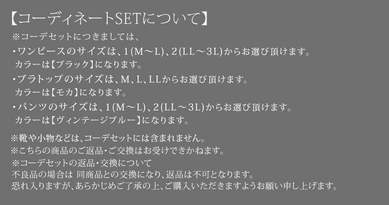 ※コーデセットの返品・交換について。不良品の場合は同商品との交換となり、返品は不可となります。恐れ入りますが、予めご了承の上、ご購入いただけますよう宜しくお願い申し上げます。