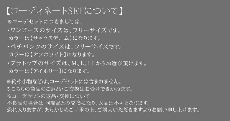 ※コーデセットの返品・交換について。不良品の場合は同商品との交換となり、返品は不可となります。恐れ入りますが、予めご了承の上、ご購入いただけますよう宜しくお願い申し上げます。