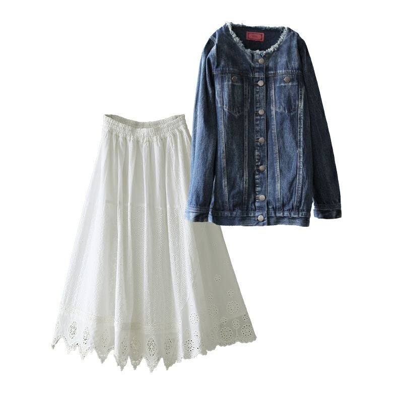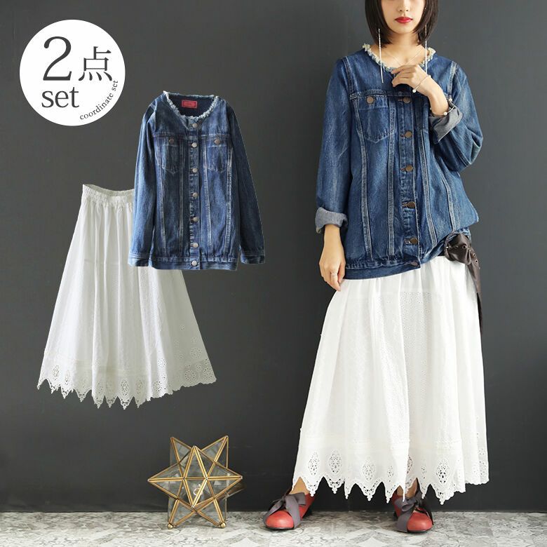 ヴィンテージ感溢れるデニムジャケットに、アンティークのようなデザインのレーススカートを合わせた、お出掛け2点コーディネートSET。