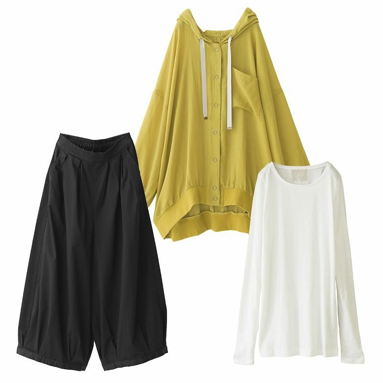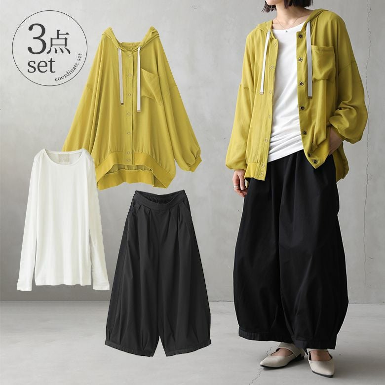 色を効かせたアイテムでモードにも決まる、3点コーディネートSET。