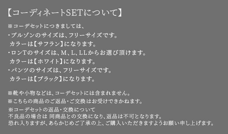 ※コーデセットの返品・交換について。不良品の場合は同商品との交換となり、返品は不可となります。恐れ入りますが、予めご了承の上、ご購入いただけますよう宜しくお願い申し上げます。