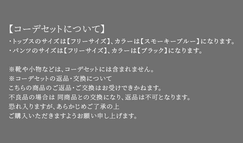 ※コーデセットの返品・交換について。不良品の場合は同商品との交換となり、返品は不可となります。恐れ入りますが、予めご了承の上、ご購入いただけますよう宜しくお願い申し上げます。